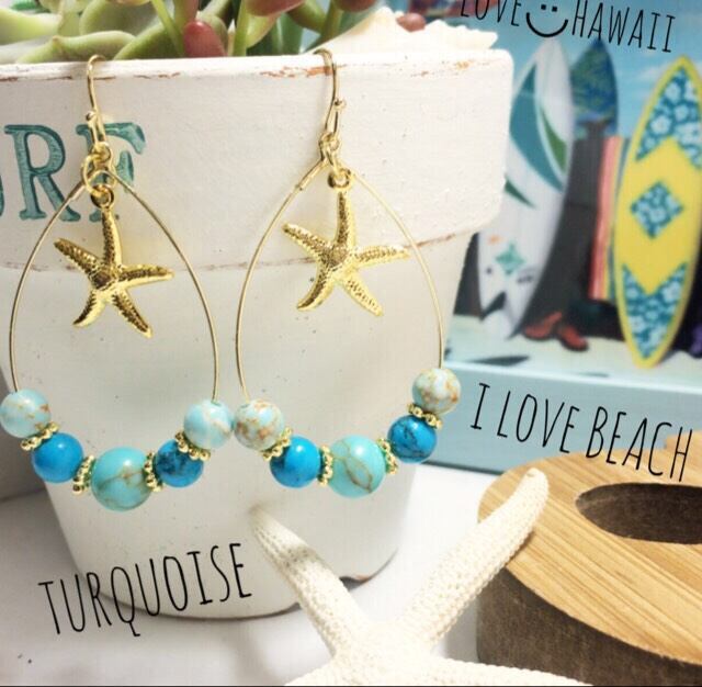 2色のターコイズとスターフィッシュチャームが、夏に涼しさをくれるピアス☆