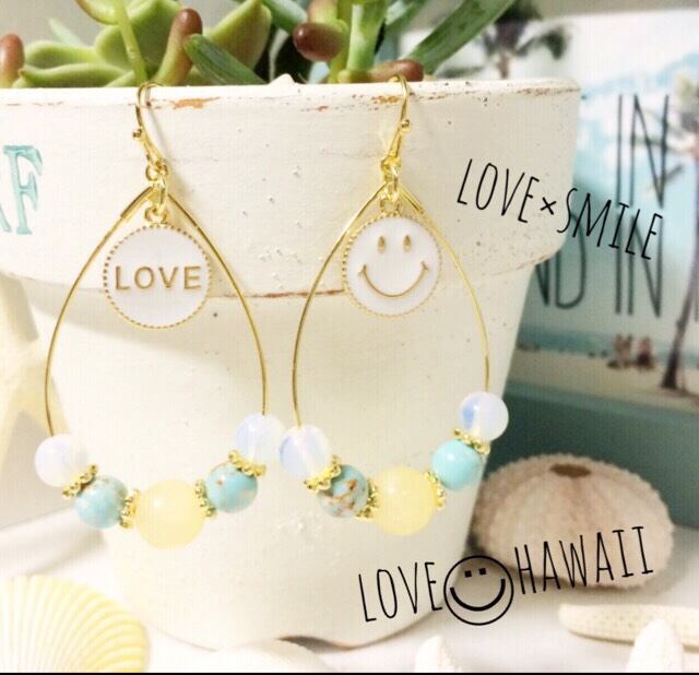 トロピカルカラーの天然石、ハニージェイドとターコイズを使用しました。ラブ&スマイルで、つけてるだけでハッピーにしてくれそうなピアスにしました◡̈⃝